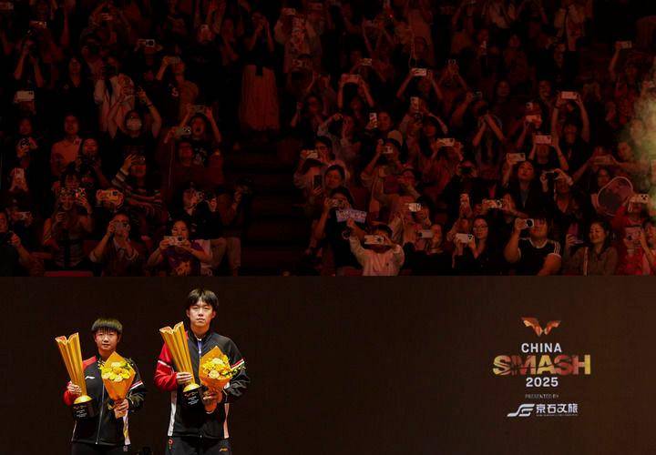 10月3日,在北京举行的2025年世界乒乓球职业大联盟(WTT)中国大满贯赛混合双打决赛后,冠军中国组合王楚钦(右)/孙颖莎在颁奖仪式上。 新华社记者 鞠焕宗 摄