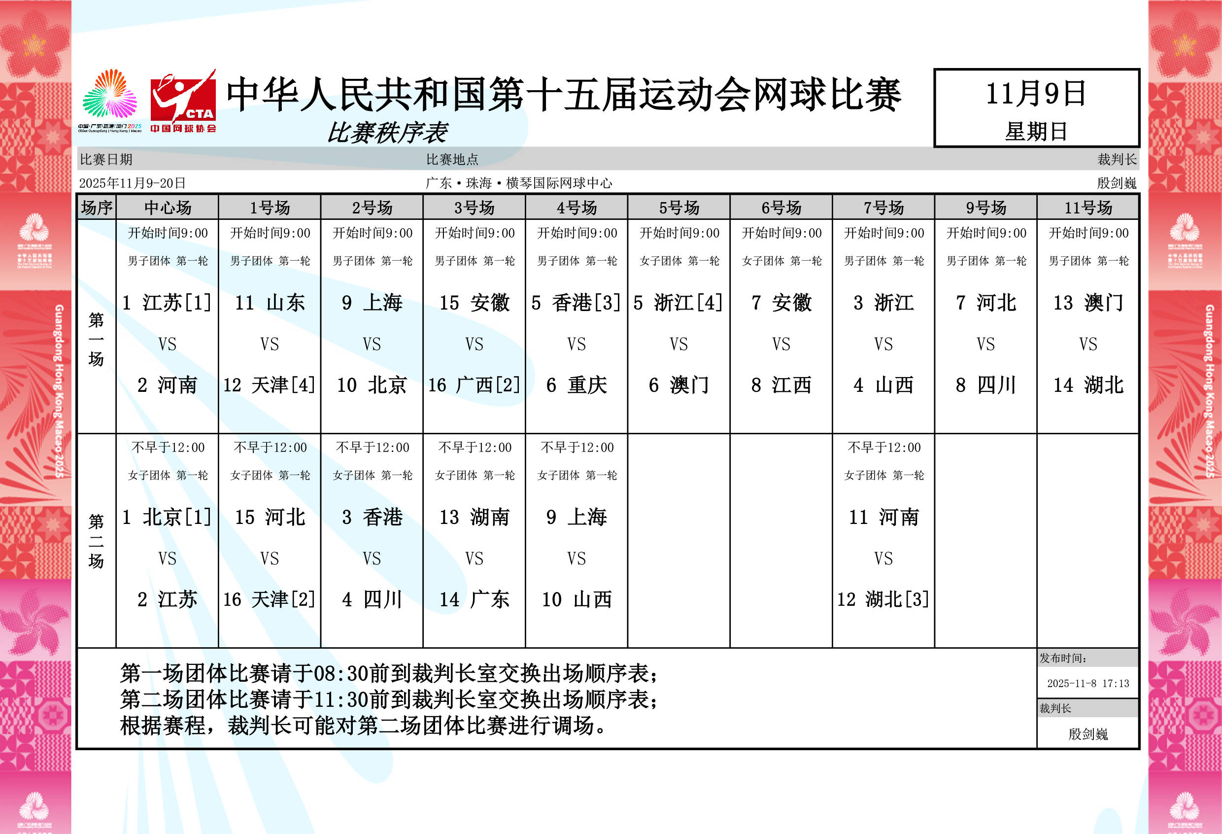 11月9日,男子团体、女子团体第一轮比赛开打,中心场的首场将进行男子团体第一轮比赛,由1号种子江苏队迎战河南队,第二场比赛将进行女子团体第一轮的比赛,由1号种子北京队对阵江苏队。商竣程所在的北京队将在2号场第一场登场,对手是上海队。