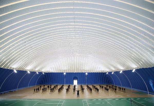 6月14日,王府社区小学的孩子们在气膜体育馆里跟随老师做武术健身操。近日,一座气膜体育馆在河北省廊坊市永清县王府社区小学投入使用。该馆建筑面积3000平方米,内设篮球场2个、羽毛球场4个、乒乓球场4个,可容纳近千人。