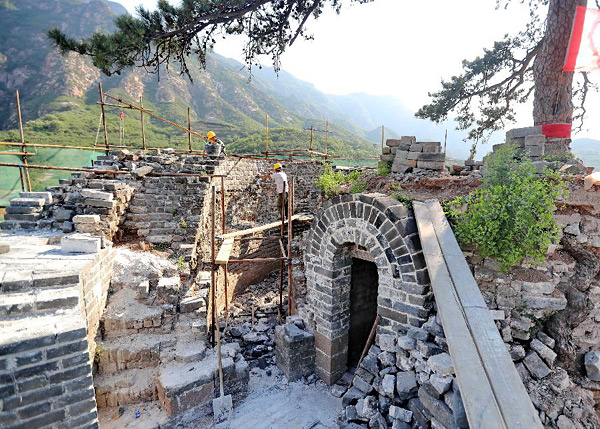 6月14日,工人在秦皇岛市驻操营镇对九门口长城点将台进行修缮。近日,河北省秦皇岛市驻操营镇九门口村的长城附属建筑点将台启动保护修缮工程。该点将台高约20米,占地200多平方米,由大小两个墩台组成,是明代九门口长城沿线防御体系的组成部分。修缮工程尊重点将台的历史原貌,在修缮中传承传统营造工艺,对塌陷部分原位补砌,并适当采取加固措施。