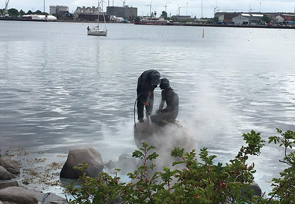 6月14日,在丹麦首都哥本哈根,工作人员清理“小美人鱼”雕塑上的油漆。继两周前被不明身份人员泼红漆以抗议法罗群岛捕鲸活动后,丹麦标志性雕塑“小美人鱼”13日夜再一次遭人为破坏,雕塑被泼上蓝色油漆。