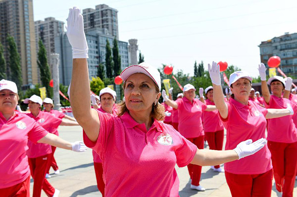 6月14日,俄罗斯一队参赛选手正在进行规定动作比赛。当日,首届中俄长寿工程杯民间广场舞健身操大赛总决赛在哈尔滨开赛。俄罗斯参赛团队于今年5月初在阿穆尔州布拉戈维申斯克市启动海选赛,最终胜出的俄罗斯一队和俄罗斯二队共50名选手代表俄罗斯,来到哈尔滨市参加本次大赛总决赛。