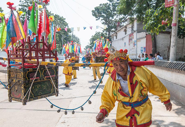 6月14日,在石家庄元氏县东正村,村民郭夕贤在排练“抬花杠”。河北省省级非遗项目“抬花杠”是石家庄元氏县东正村的传统表演项目,起源于隋唐年间,原来是在春节、庙会时祭祀三皇姑仪仗队领队的舞种,后来除了祭祀仪式外,也成为当地村民们自娱自乐的一种民间团体舞蹈。 “抬花杠”杠长约四米,中间的箱子重四五十斤,雕龙画凤,抬着花杠的两位舞者不能用手扶杠,仅用肩、颈、头、腰等部位控制,做出各种动作,需要十分默契,同时最少四抬、多则几十抬花杠同场表演,要求团队配合,表演难度较大。