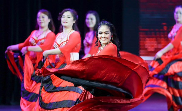 6月13日,参赛队在表演广场舞。 当日,2017“全民健身日红舞中国行”全国广场舞巡回赛长沙站在湖南省花鼓戏剧院举行,来自湖南的六十五支参赛队伍在舞台上表演广场舞。