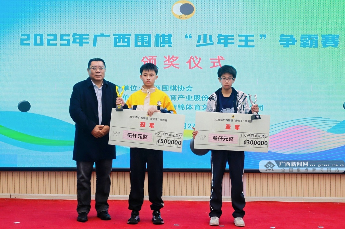 同期,2025年广西围棋“少年王”争霸赛也在同一场地展开激战。2025年广西少年围棋锦标赛5段组冠军李明蔚与2025年广西青少年围棋精英赛5段组冠军赖家宁狭路相逢,上演了一场精彩对决。最终李明蔚以总比分2:0取胜,荣获新一届“广西围棋少年王”称号。
