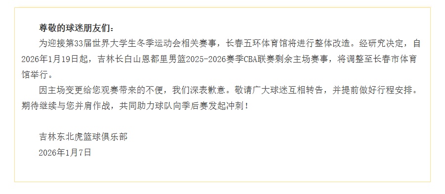 网球联赛,ATP赛程,WTA积分,网球直播入口,网球世界排名,四大满贯赛/实时更新全球网球联赛2025赛程、比分、排名及直播,全面覆盖ATP男子联赛、WTA女子赛事、四大满贯及国内网球比赛,为中文网球迷提供权威资讯与竞猜预测支持。1月7日,吉林东北虎男篮俱乐部发布公告,为迎接第33届世界大学生冬季运动会相关赛事,长春五环体育馆将进行整体改造。经研究决定,自2026年1月19日起,吉林长白山恩都里男篮2025-2026赛季CBA联赛剩余主场赛事,将调整至长春市体育馆举行。