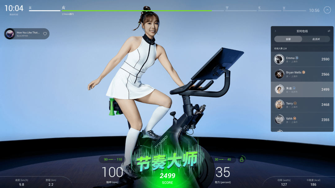 TANGO 旗下的主打产品 TANGO 音乐飞轮,就是一款让人享受快乐运动的燃脂神器,其沉浸式的音乐骑行派对体验和游戏化骑行体验,让人在燃脂暴汗的同时,享受到运动带来的多巴胺和内啡肽自由。