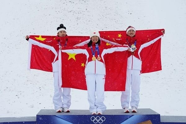 当地时间2026年2月21日,意大利,2026年米兰-科尔蒂纳冬奥会自由式滑雪空中技巧混合团体决赛,中国队夺得铜牌。视觉中国供图