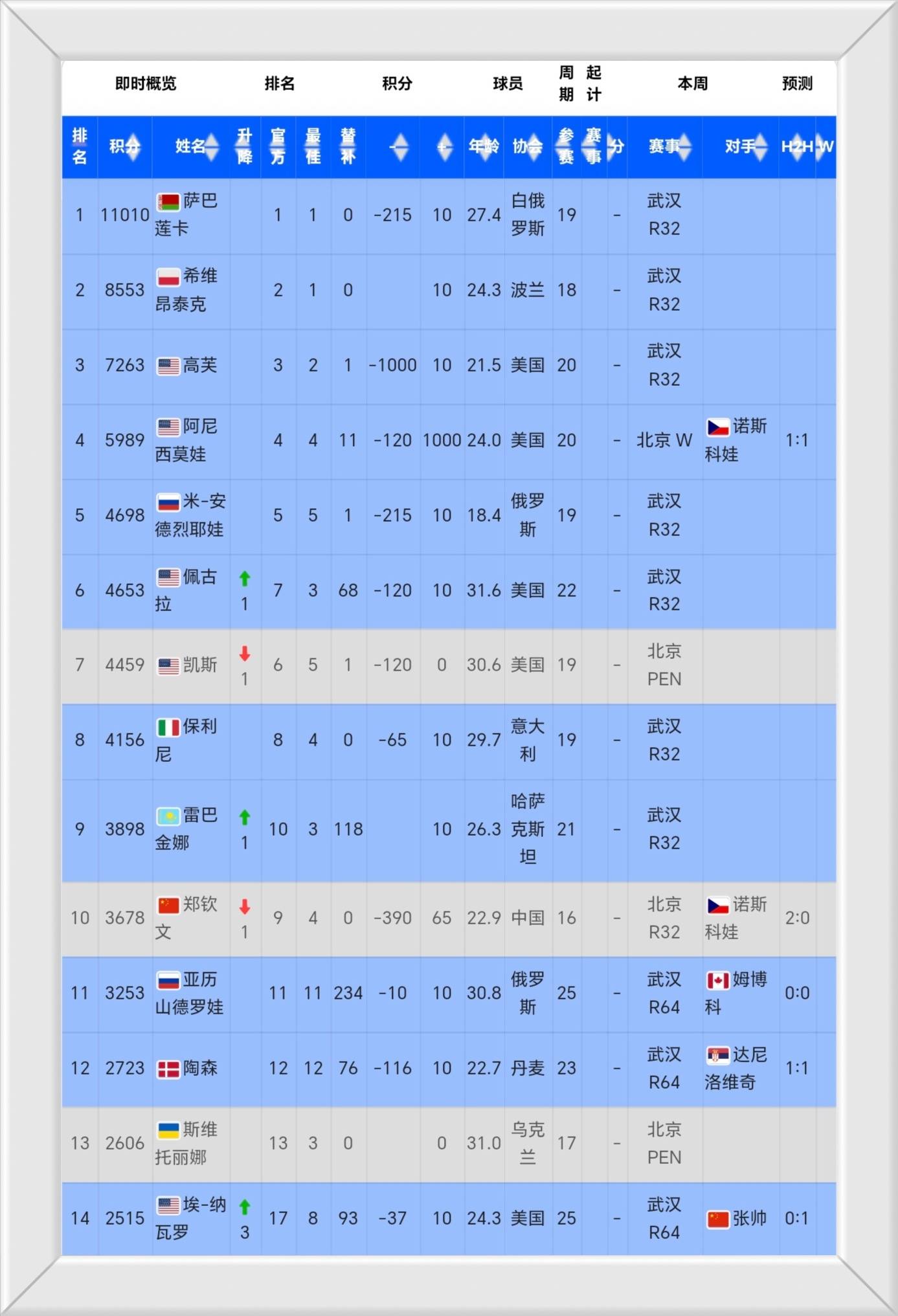 随着中网的落幕,WTA的世界排名也迎来了一次新的洗牌。白俄罗斯名将萨巴伦卡依然稳坐世界第一的宝座,波兰名将斯瓦泰克和美国新星高芙紧随其后,分列第二、三位。而凭借着中网的惊艳表现,阿尼西莫娃的积分飙升至5989分,成功跻身世界第四。几家欢喜几家愁,美国选手凯斯和中国一姐郑钦文的排名则有所下滑。特别是郑钦文,以3678分的积分跌至第十位,也因此失去了“亚洲一姐”的头衔。更令人担忧的是,由于接下来即将扣除武汉公开赛的650个积分,郑钦文的排名下周很可能会跌出前十行列,面临着更加严峻的挑战。