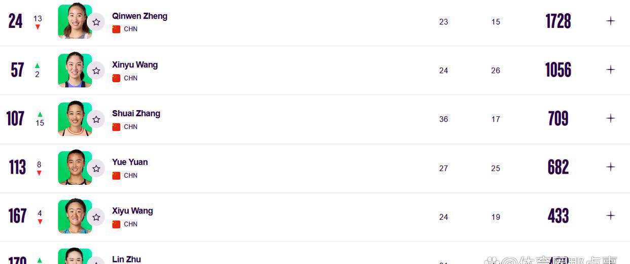 除了郑钦文外,其他中国选手也有所表现:王欣瑜略微上升2位,她在过去的中国赛季成绩不尽如人意,经常提前出局。张帅上升15位,来到第107位,在最近结束的广网上进入了半决赛,不过在首盘比赛还未结束就因伤退赛。