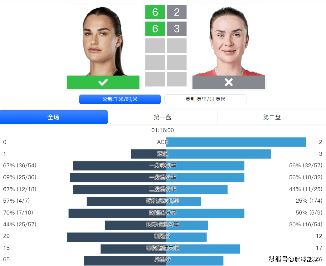 全场比赛,萨巴伦卡的一发得分率69%比56%、二发得分率67%比56%、破发点转化率57%比25%、网前得分率70%比56%、接发球得分率44%比30%、制胜分29个比12个、总得分65比46。