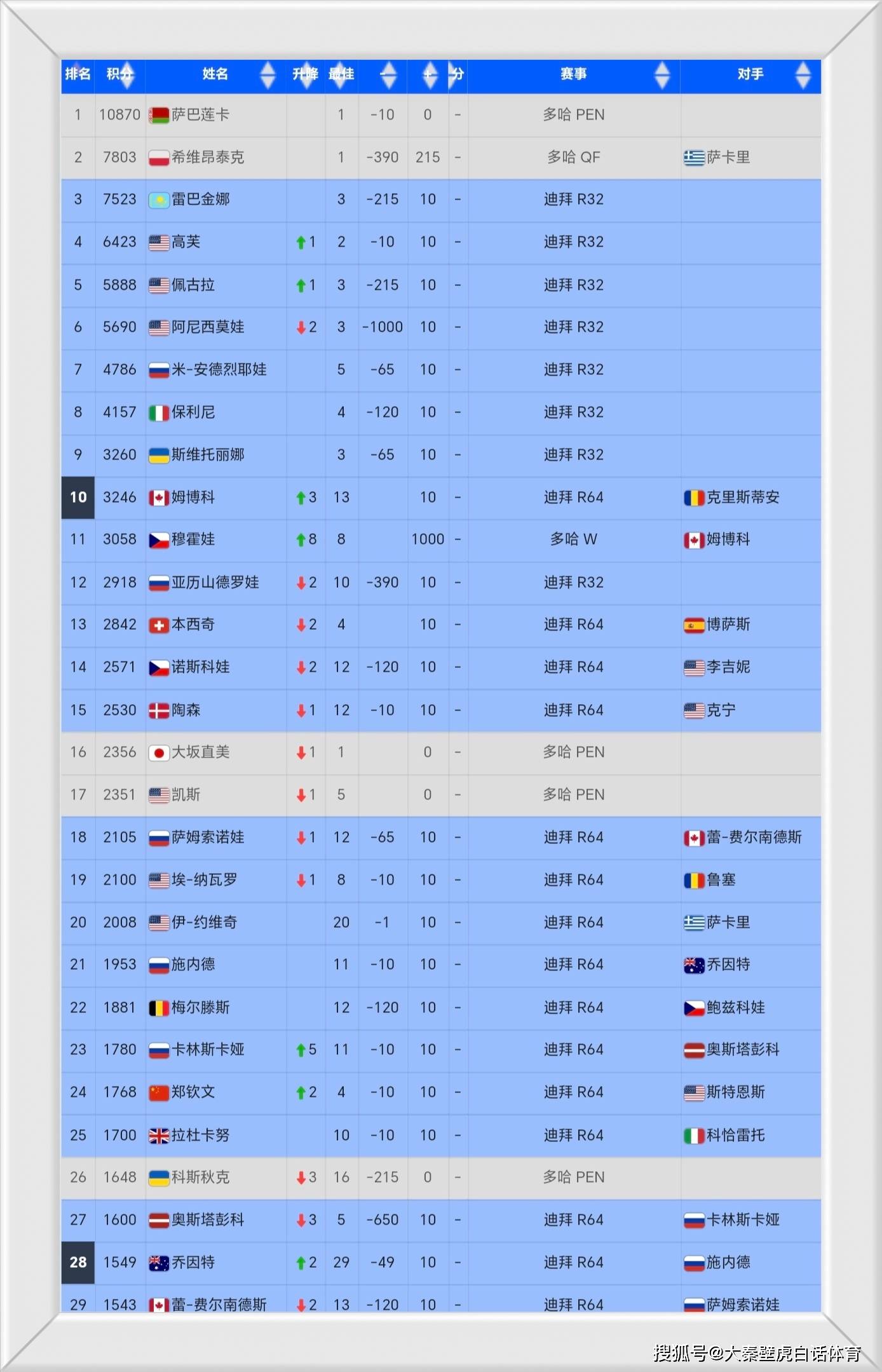 尽管缺席了多哈站,世界第一萨巴伦卡仍然以10870分牢牢占据榜首宝座,也是唯一积分破万的球员,接下来白俄罗斯虎妞又退出迪拜1000赛的争夺,虽然不能净增分,短期内球后宝座不可撼动。